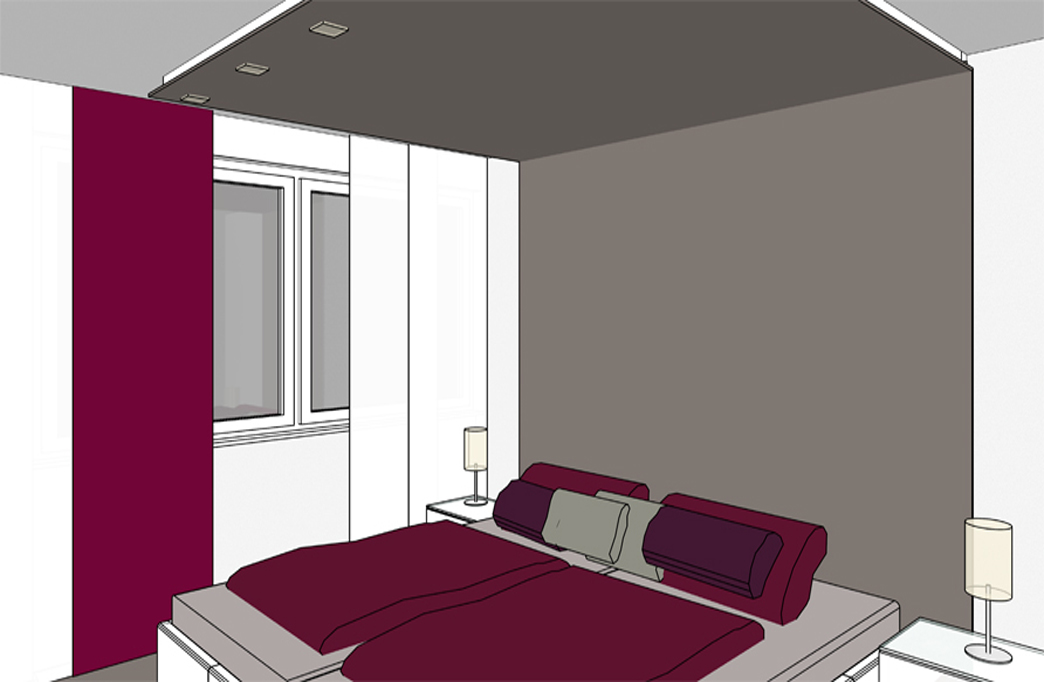 Mit einem 4 m breiten Kleiderschrank und umlaufender Abkofferung für indirekte LED Beleuchtung wird das Schlafzimmer zum Wohlfühlort.